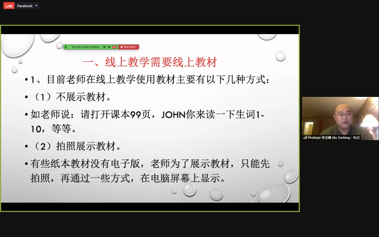 随后,片库网 目前在美国任教的牟云峰副教授做《关于线上对外汉语教材的几点思考》的报告。他分析了目前线上汉语教学存在的问题,认为目前线上教学中的师生互动较为受限乃至缺失,提出线上教学需要真正意义上的线上教材,并就理想的“线上对外汉语教材”进行分析和阐述。