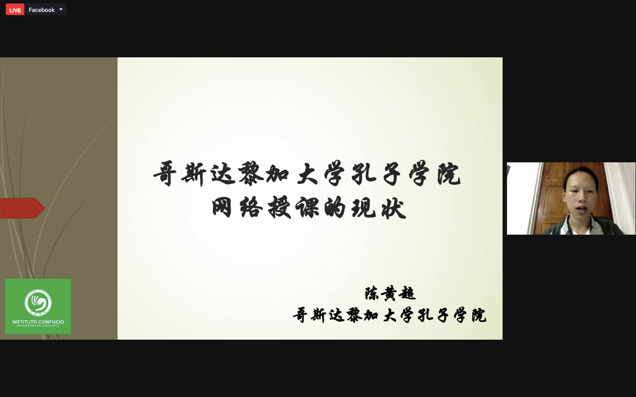 之后,哥斯达黎加大学孔子学院的陈黄超老师做会议报告,题目为《哥斯达黎加大学孔子学院网络授课的现状》。陈老师分别介绍了哥斯达黎加大学孔子学院的网络教学所取得的成果以及所存在的问题。他指出,哥斯达黎加大学孔子学院在疫情之下积极探索网络汉语教学新模式,2020年新冠疫情爆发后,在网络授课环境下,哥斯孔院新增学员294人,总学员达1178人,较2019年招生增长率为33%。他们充分利用网络资源,每周都会给学生提供1-2次的在线文化交流活动,通过Facebook Live直播,让更多对汉语和中国文化感兴趣的拉美国家人民有了更多了解中国的新方式。