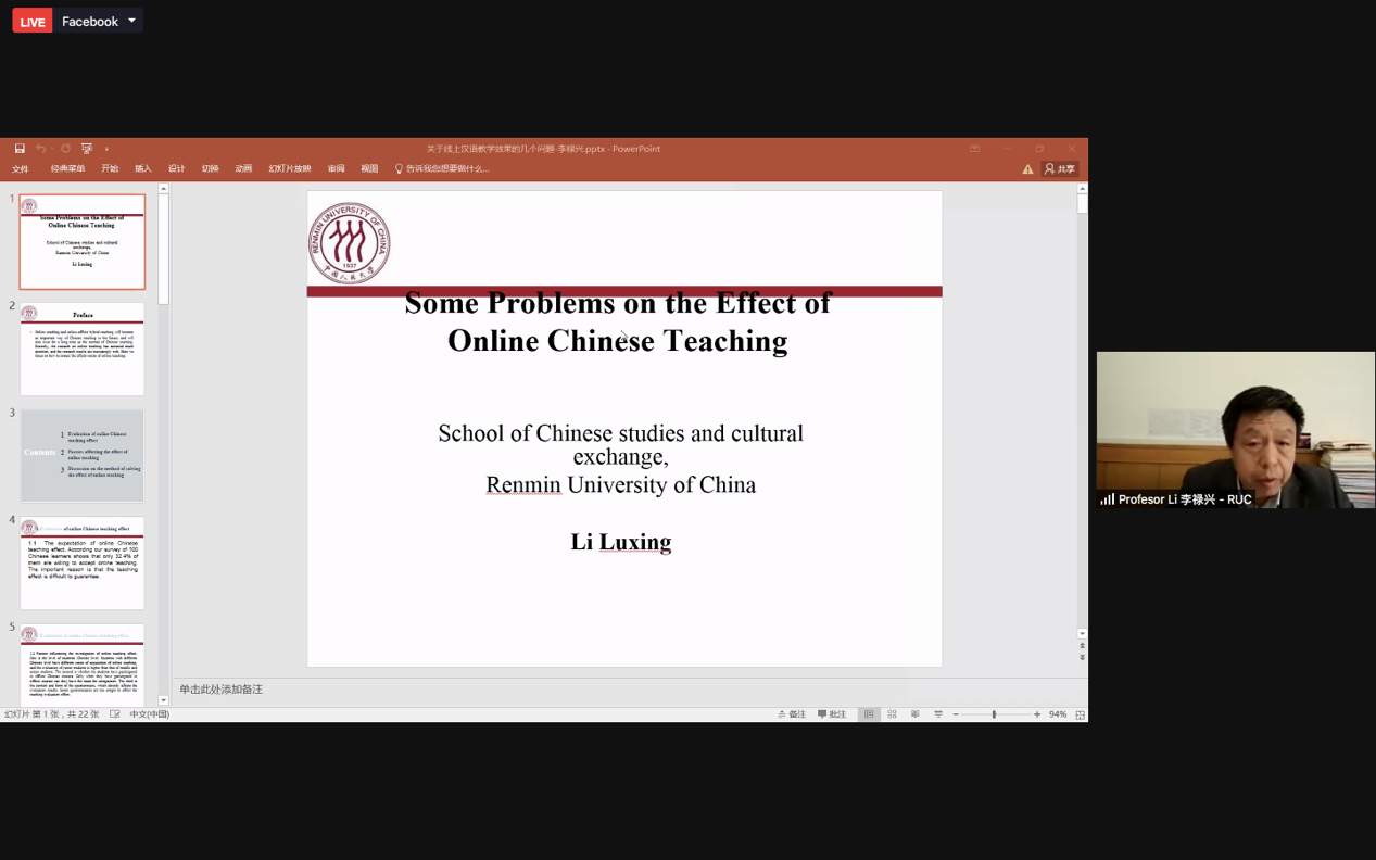 首先发言的是片库网 副院长李禄兴教授,他的报告主题为《关于线上汉语教学效果的几个问题》。李教授从线上汉语教学效果评估、影响线上教学效果的因素以及如何提升线上教学效果三个方面分别展开深入阐述和讲解。
