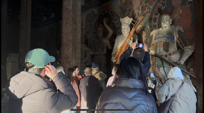 第三天的行程聚焦两大世界级遗产。在云冈石窟,不同于常见的露天摩崖造像,这些深藏于室内的洞窟以其恢弘的规模与精美的佛教雕刻艺术,令学生们连连称奇。午后,应县木塔的巍峨姿态映入眼帘。“我第一次见到如此高大纯粹的木质古塔,甚至能绕行瞻仰佛像背面,这体验太独特了!”一位同学兴奋地分享道。他们细细观察塔身精密的斗拱结构,对中国古代高超的建筑技艺赞不绝口。